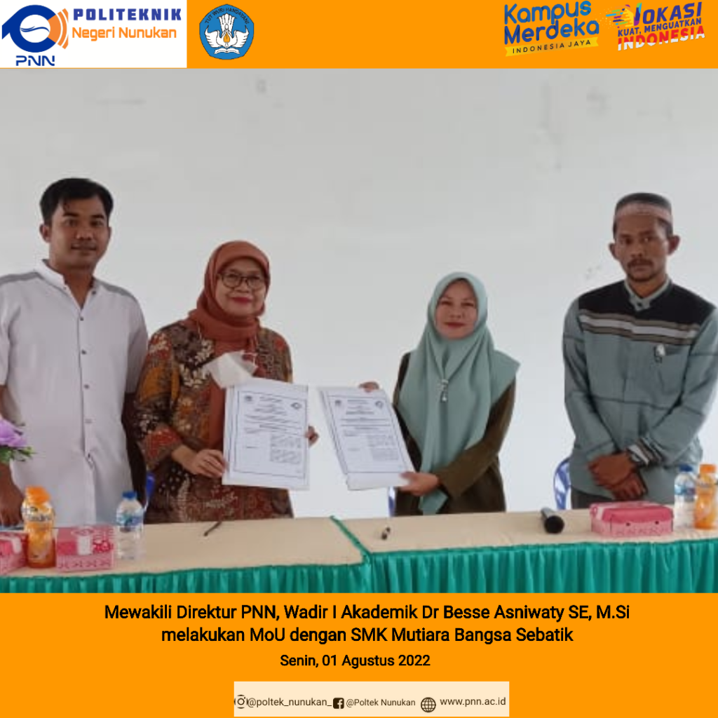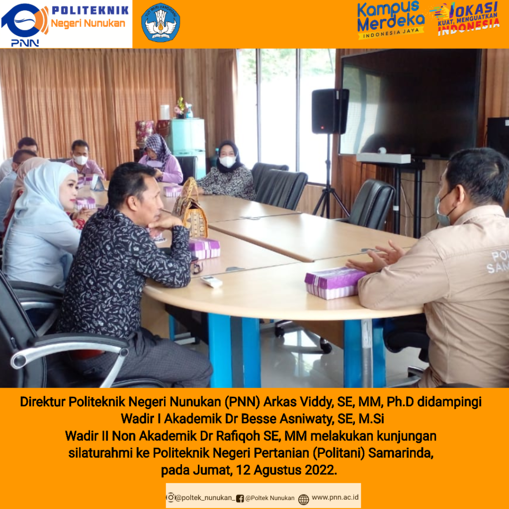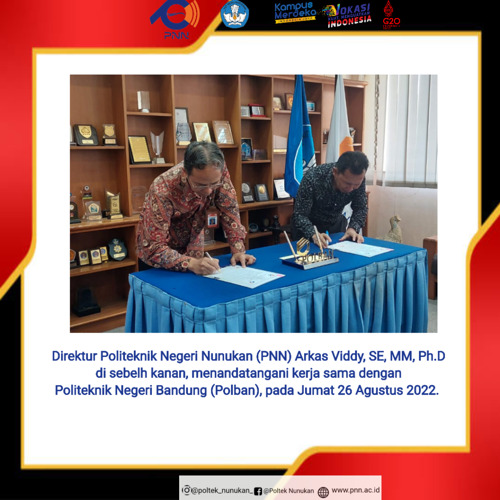 NUNUKAN, PNN- Direktur Politeknik Negeri Nunukan (PNN) Arkas Viddy, SE, MM, Ph.D melakukan kerja sama dengan Politeknik Negeri Bandung (Polban), pada Jumat 26 Agustus 2022. Direktur PNN meneken Memorandum of Understanding (MoU) sebagai pihak pertama di ruang rapat Direktur Polban Dr. Ir Rachmad Imbang Tritjahjono, MT yang juga turut bertandatangan dan bertindak sebagai pihak kedua. …