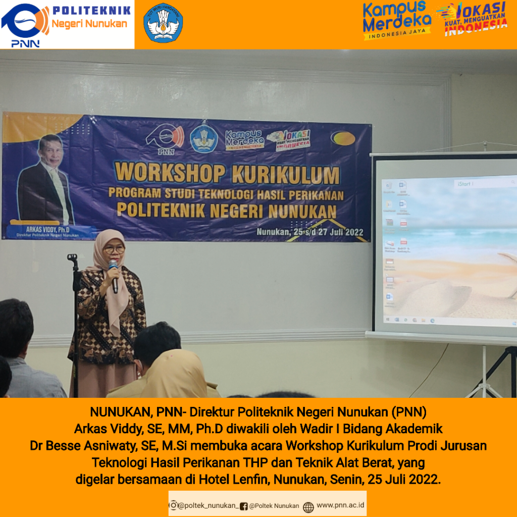 NUNUKAN, PNN- Direktur Politeknik Negeri Nunukan (PNN) Arkas Viddy, SE, MM, Ph.D diwakili oleh Wadir I Bidang Akademik Dr Besse Asniwaty, SE, M.Si membuka acara Workshop Kurikulum Prodi Jurusan Teknologi Hasil Perikanan THP dan Teknik Alat Berat, yang digelar bersamaan di Hotel Lenfin, Nunukan, Senin, 25 Juli 2022. Hadir dalam acara tersebut pemateri workshop kurikulum …