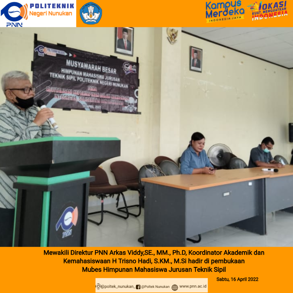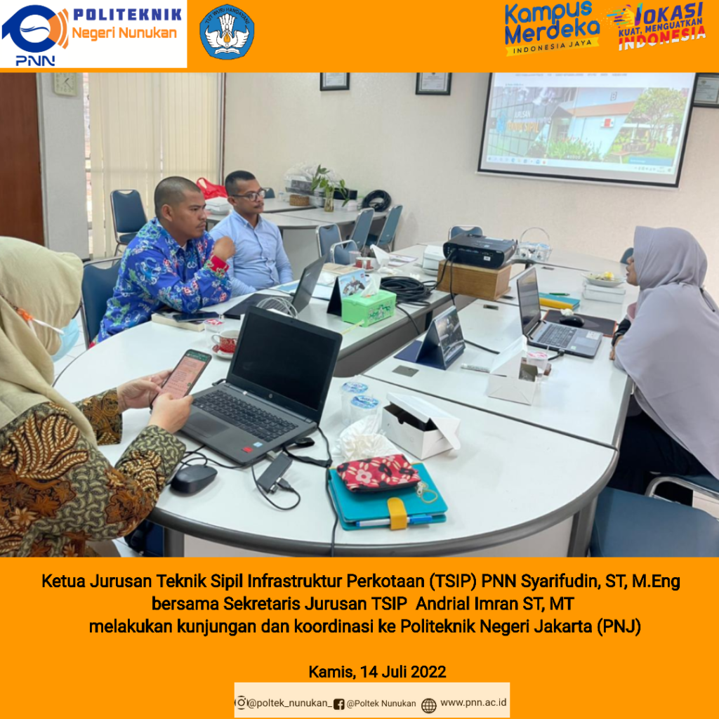 JAKARTA, PNN- Ketua Jurusan Teknik Sipil Infrastruktur Perkotaan (TSIP) Politeknik Negeri Nunukan (PNN) Syarifudin, ST, M.Eng bersama Sekretaris Jurusan TSIP Andrial Imran ST, MT melakukan kunjungan dan koordinasi ke Politeknik Negeri Jakarta (PNJ) pada Kamis, 14 Juli 2022. Kajur TSIP PNN Syarifudin mengatakan, hal ini bertujuan untuk merancang Benchmarking dan Koordinasi pelaksanaan Workshop Kurikulum dengan …