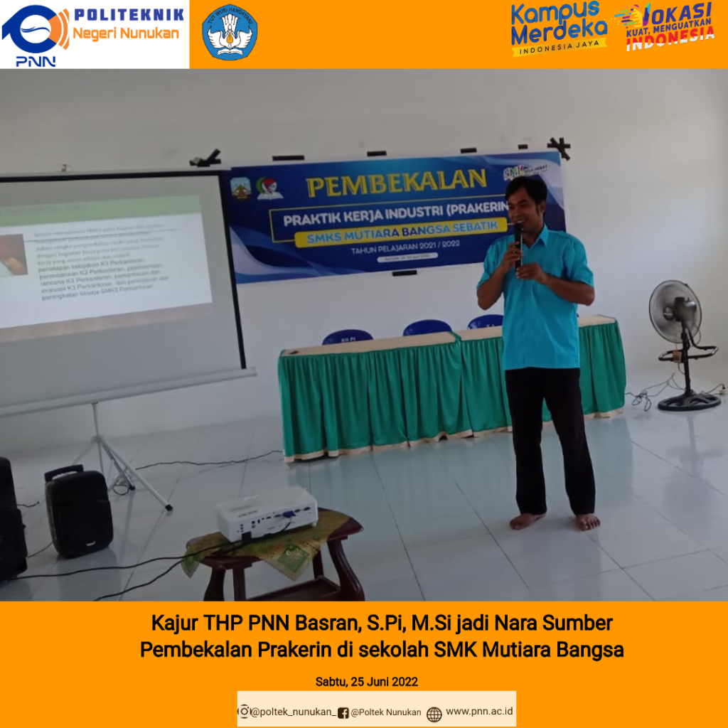 NUNUKAN, PNN- Kajur Teknologi Hasil Perikanan (THP) Politeknik Negeri Nunukan (PNN) Basran S.Pi, M.Si menjadi Nara sumber Pembekalan Praktek Kerja Industri (Prakerin) di SMK Mutiara Bangsa Sebatik, pada Sabtu, 25 Juni 2022. Dalam penyampaiannya Basran menjelaskan perihal pengertian sistem manajemen Keselamatan dan Kesehatan Kerja (K3). “Saya menjelaskan masalah K3 di perkantoran yang sering muncul, insiden, …