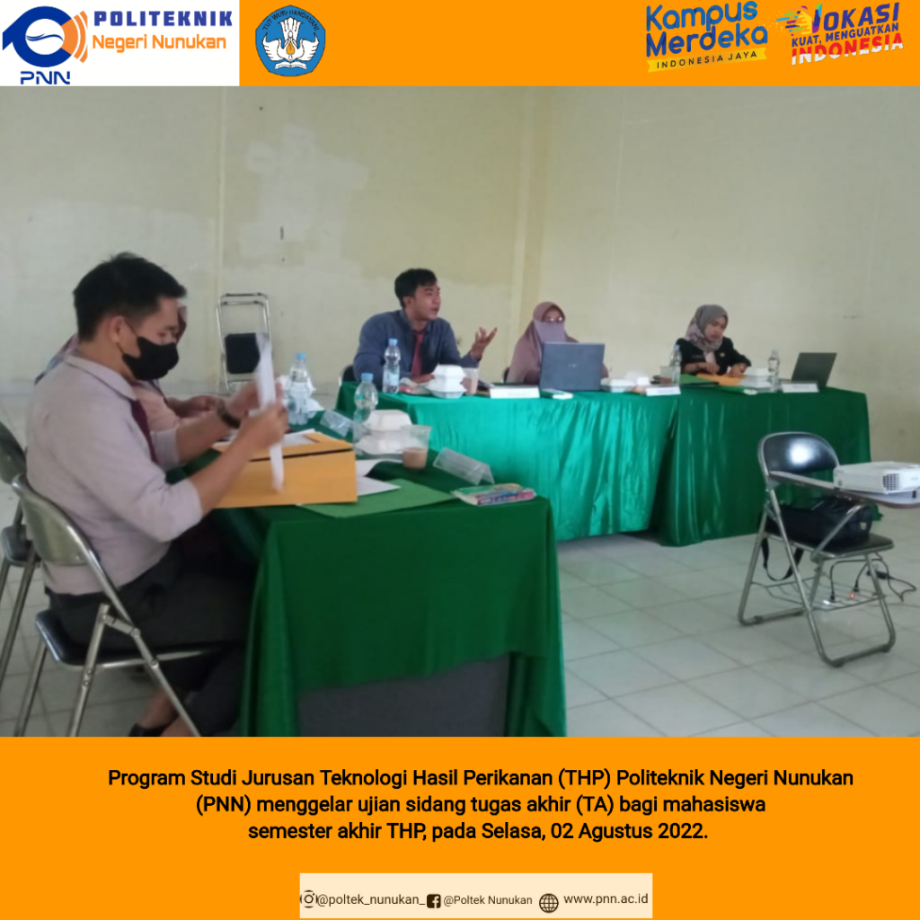 NUNUKAN, PNN- Program Studi Jurusan Teknologi Hasil Perikanan (THP) Politeknik Negeri Nunukan (PNN) menggelar ujian sidang tugas akhir (TA) bagi mahasiswa semester akhir THP, pada Selasa, 02 Agustus 2022. Ketua Jurusan THP Basran S.Pi M.Si mengatakan, ada sebanyak 21 mahasiswa yang akan mengikuti prosesi ujian TA tahun ini. “Alhamdulillah ini adalah fase terakhir mahasiswa kami …
