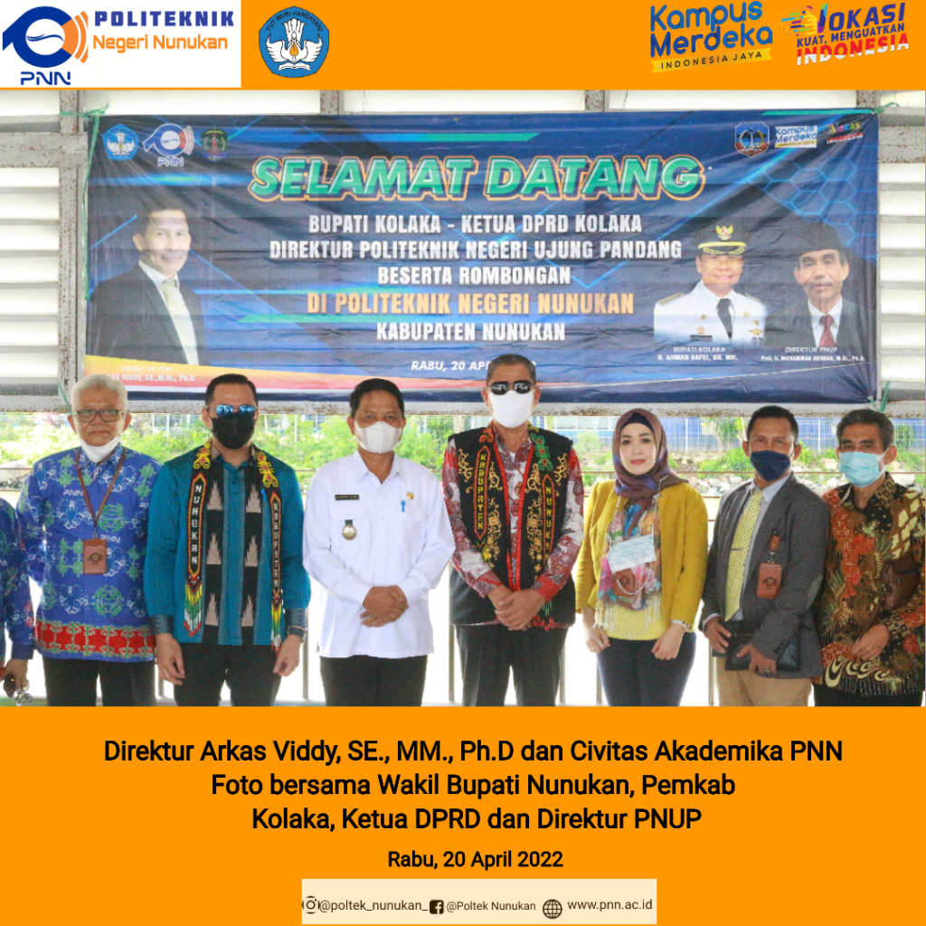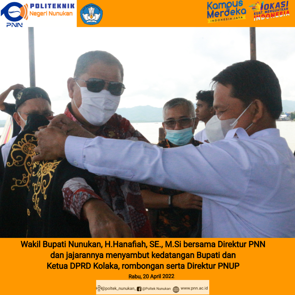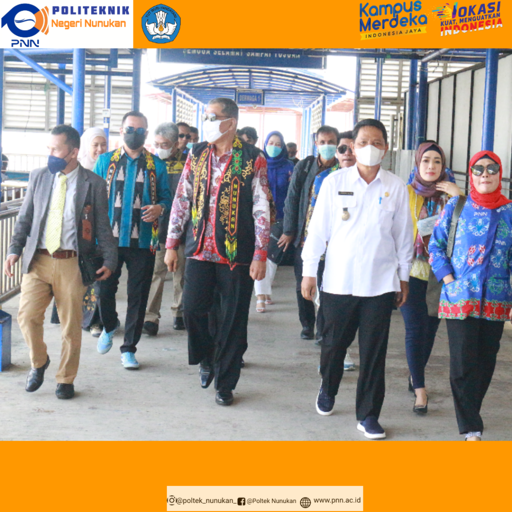 NUNUKAN, PNN- Direktur Politeknik Negeri Nunukan (PNN) Arkas Viddy SE., MM., Ph.D, Wadir II Dr. Rafiqoh SE., MM, Koordinator Akademik dan Kemahasiswaan, Kepala UPT Teknologi Informasi, Kepala UPT Umum dan Kepegawaian beserta Para Kajur lingkup PNN menjemput rombongan Bupati Kolaka H.Ahmad Safei SH, MH, Ketua DPRD Kolaka Ir. Syaifullah Halik, Direktu Politeknik Negeri Ujung Pandang (PNUP) Prof.Ir. Muhammad Anshar, Ph.D beserta rombongan pada Rabu, 20 April 2022 di PLBL Liem Hie Jhung.