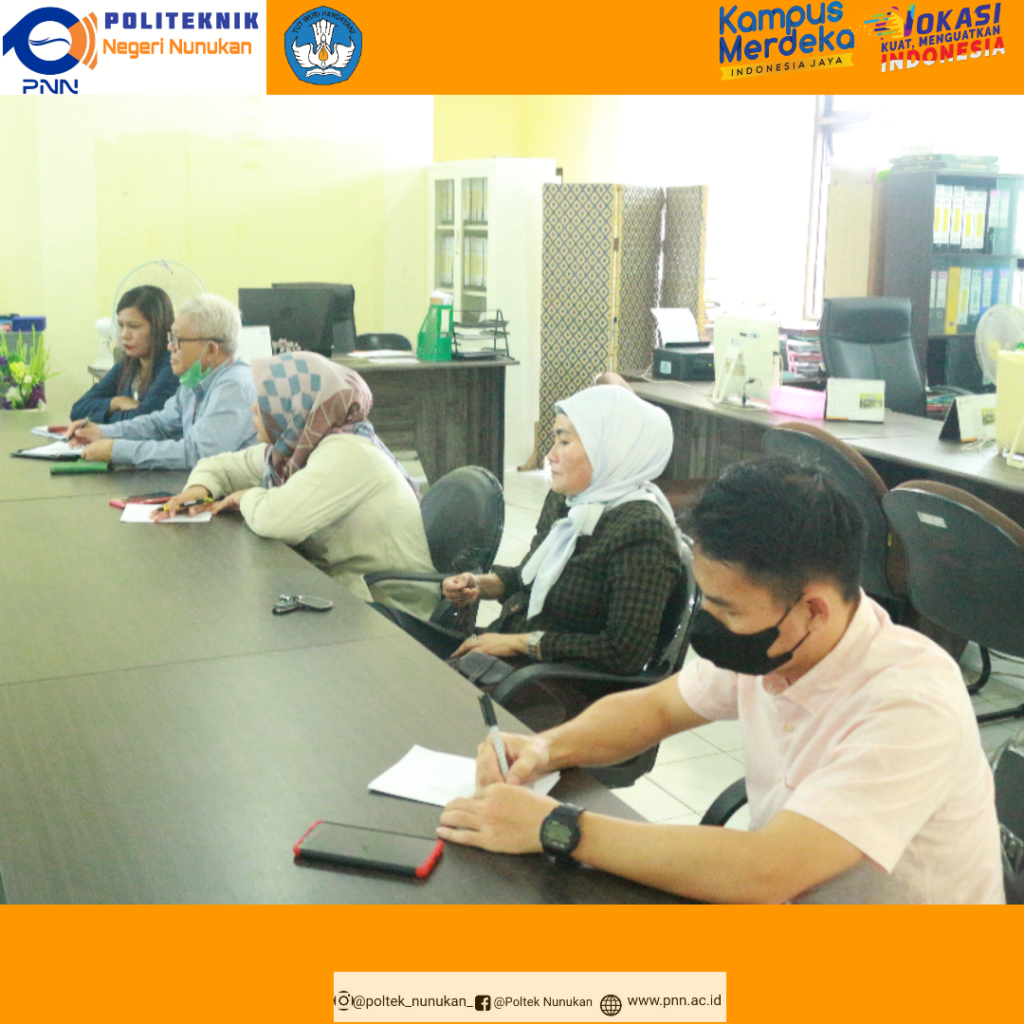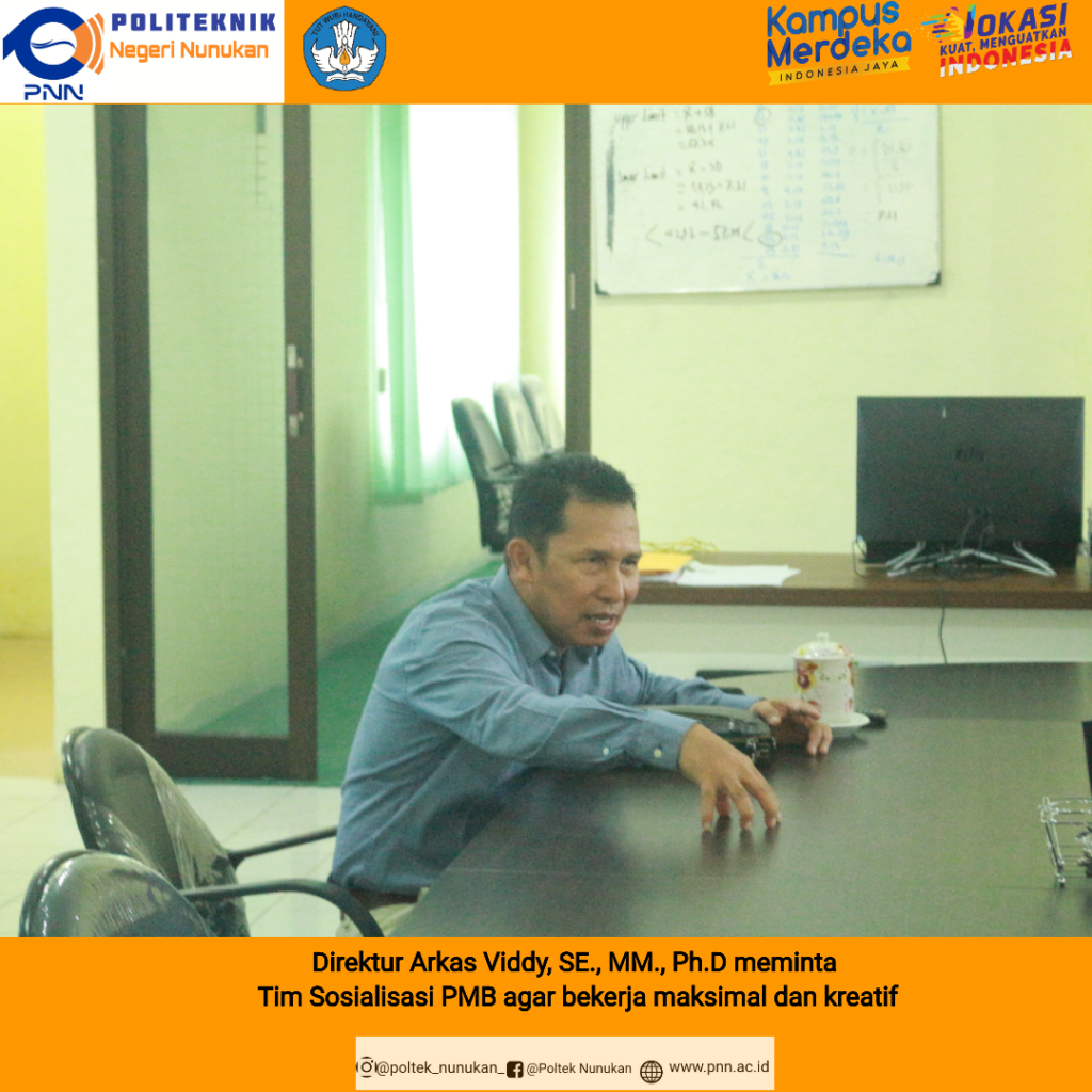NUNUKAN, PNN- Direktur Politeknik Negeri Nunukan (PNN) Arkas Viddy, SE., MM., Ph.D menggelar rapat Evaluasi Tim Sosialisasi Penerimaan Mahasiwa Baru (PMB), Senin 20 Juni 2022.