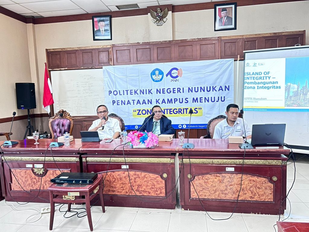 PNN – Senin, 30 September 2024. Direktur Politeknik Negeri Nunukan Bpk Arkas Viddy, Ph.D Bersama KPPN Kabupaten Nunukan yang diwakili oleh Bpk Kukuh Budiwarsono dan Bpk. Indra Yusak dan Bpk Ahmad Zubair Sultan, S.T. , M.T. , Ph.D selaku Dosen Politeknik Negeri Ujung Pandang, menjadi narasumber dalam kegiatan “Politeknik Negeri Nunukan Penataan Kampus Menuju Zona Integritas”. Acara ini diselenggarakan di Kantor Bupati Kabupaten Nunukan, dengan perwakilan staff dan dosen Politeknik Negeri Nunukan sebagai pesertanya.