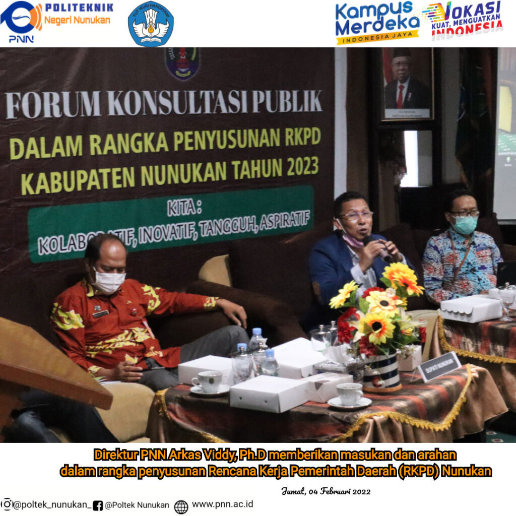 NUNUKAN, PNN- Pemerintah Kabupaten Nunukan melalui Badan Perencanaan Pembangunan Daerah, Penelitian dan Pengembangan (Bappeda), menggelar Forum Konsultasi Publik dalam rangka penyusunan Rencana Kerja Pemerintah Daerah (RKPD) Tahun 2023, Jumat, (4/2/22). Hadir dalam acara tersebut kepala Organisasi Perangkat Daerah (OPD) lingkup Nunukan, Tokoh Masyarakat, Perwakilan LSM dan lain-lainnya.  Direktur Politeknik Negeri Nunukan (PNN) Arkas Viddy, Ph.D …