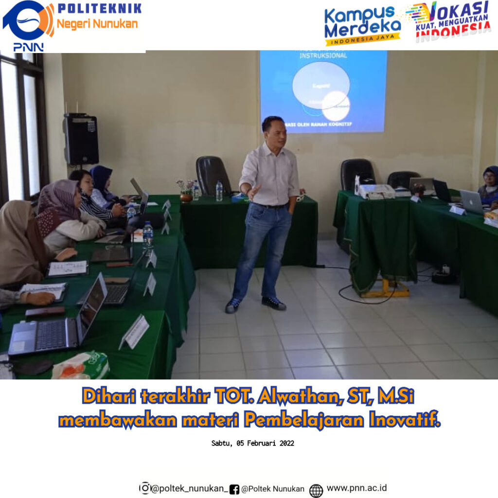 NUNUKAN, PNN, Training Of Trainer (TOT) Dosen Politeknik Negeri Nunukan dari tanggal 03-5 Februari 2022. Dihari terakhir, bapak Alwathan, ST, M.Si membawakan materi Pembelajaran inovatif.   Alwathan mengatakan merujuk pada framework for 21st century learning dengan komponen, pertama, lingkungan pembelajaran. Kedua, pengembangan kemampuan professional. Ketiga, kurikulum dan instruksionalnya, dan keempat, standard dan penilaian, menjadi gerbang masuk …