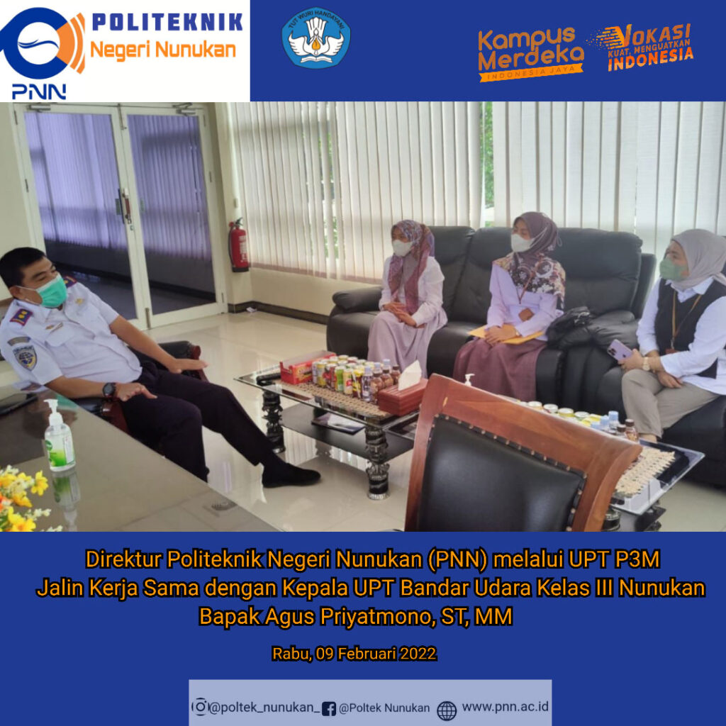 NUNUKAN, PNN- Kampus Politeknik Negeri Nunukan (PNN) melalui Kepala UPT Pusat Penelitian dan Pengabdian Masyarakat (P3M) Siti Hajar S.Si, M.Pd jalin kerja sama lembaga vertikal negara yakni dengan Kepala Kantor Unit Penyelenggara Bandar Udara (UPBU) Kelas III Nunukan, Agus Priyatmono, ST, MM.  Siti Hajar mengatakan kerja sama dilakukan sebagai bentuk upaya peningkatan pengabdian masyarakat yakni …