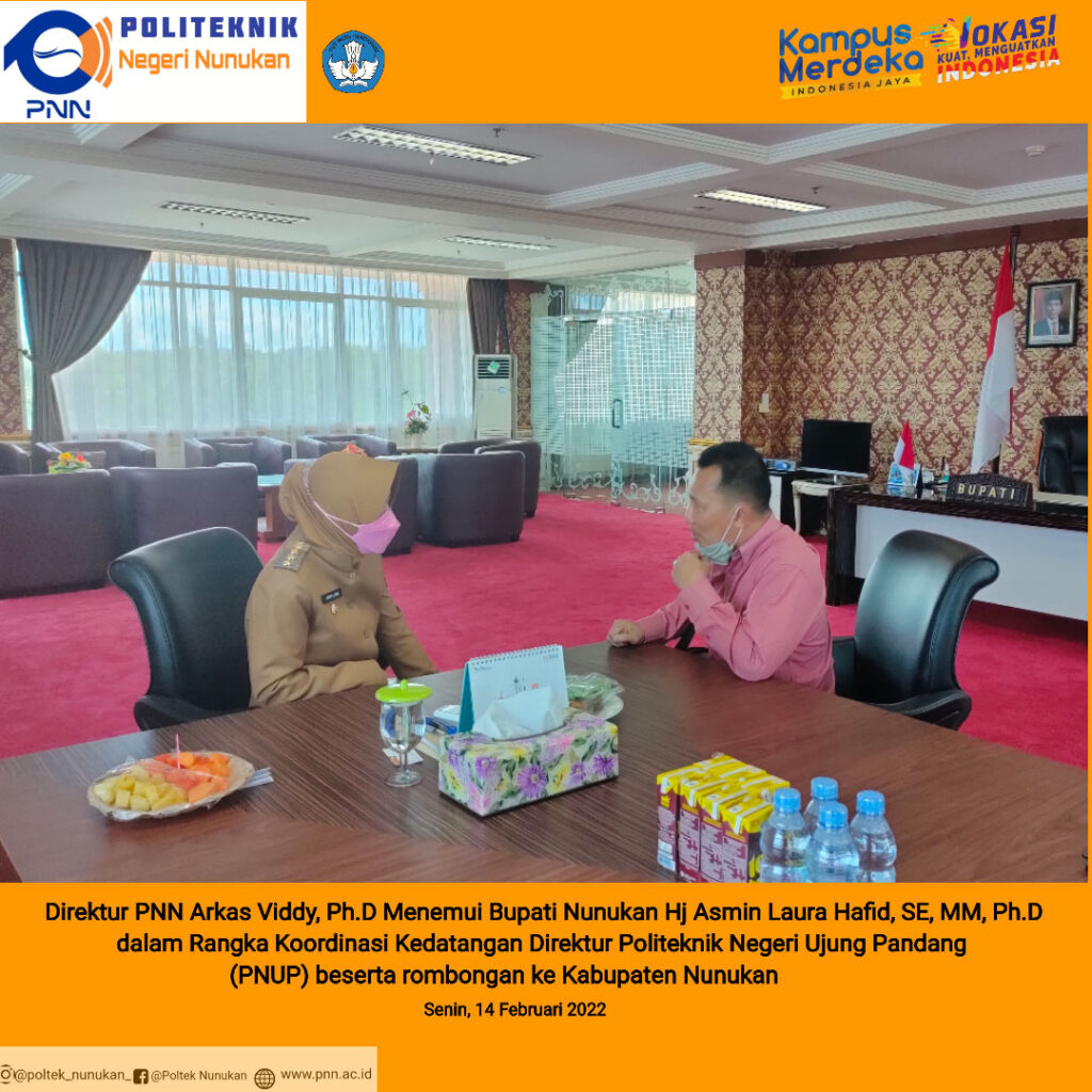 NUNUKAN, PNN- Direktur Politeknik Negeri Nunukan (PNN) Arkas Viddy, Ph.D  Senin, (14/02/22) lakukan koordinasi dan komunikasi ke Bupati Nunukan Hj Asmin Laura Hafid, SE, MM, Ph.d di Ruang Bupati Nunukan, Senin (14/02/22).   Pertemuan yang dilakukan guna menindaklanjuti agenda kedatangan Direktur Politeknik Negeri Ujung Pandang (PNUJ) beserta rombongan Binaan program studi di luar kampus utama (PSDKU) …