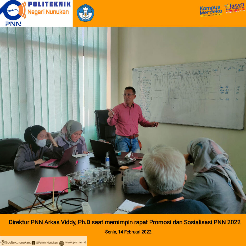 NUNUKAN, PNN- Direktur Politeknik Negeri Nunukan (PNN) Arkas Viddy, SE, MM, Ph.D lakukan rapat Promosi dan Sosialisasi PNN 2022 di ruang rapat Direktur. Hadir dalam pertemuan tersebut Tim Panitia Sosialisasi yakni Wadir I Akademik Dr. Besse Asniwaty SE, MM, Kajur, Sekjur, KaProdi, Koordinator Akademik dan Bidang TI.  Direktur PNN mengatakan, Promosi dan Sosialisasi Penerimaan Mahasiswa …