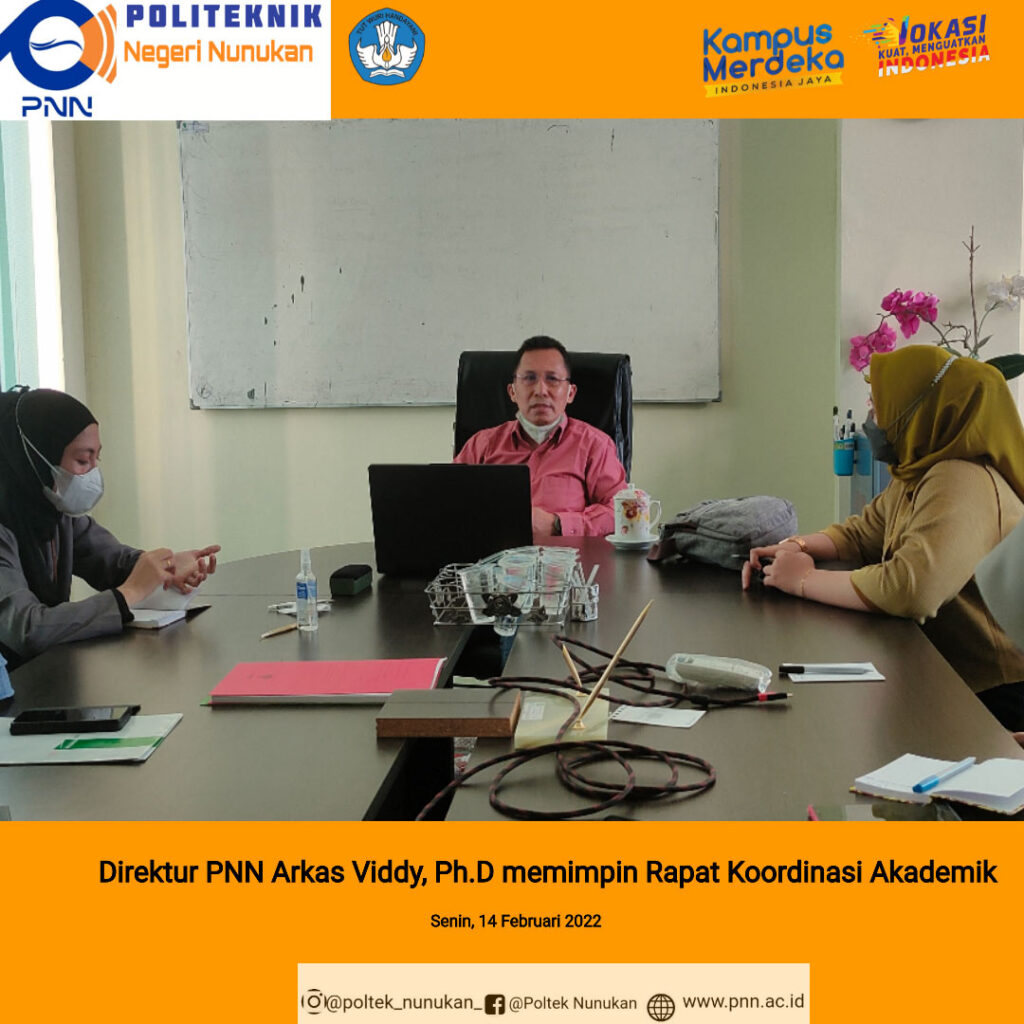 NUNUKAN, PNN- Direktur Politeknik Negeri Nunukan (PNN) Arkas Viddy, Ph.D memimpin rapat koordinasi Akademik terkait evaluasi Sosialisasi Penerimaan Mahasiswa Baru (PMB) tahun 2022/2023 di Ruang Rapat Direktur, Senin, (14/02/22). Direktu PNN menyampaikan bahwa evaluasi tersebut bertujuan untuk memperkuat harmonisasi antara lini bagian akademik. “Rapat koordinasi ini untuk membangun sinergitas sehingga bergerak sesuai dengan target yang ada,” kata …