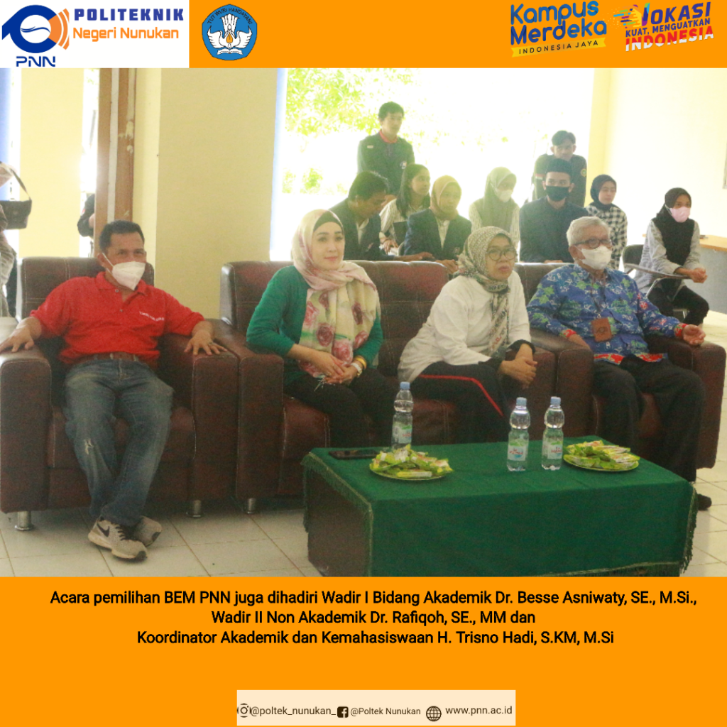 Acara pemilihan BEM PNN dihadiri Wadir I Bidang Akademik Dr. Besse Asniwaty SE., M.Si., Ph.D, Wadir II Non Akademik Dr. Rafiqoh, SE., MM dan Koordinator Akademik dan Kemahasiswaan PNN H. Trisno Hadi, S.KM, M.Si serta seluruh mahasiswa lingkup PNN.