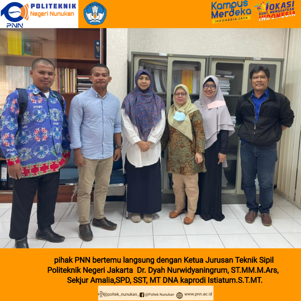 Adapun pihak PNN bertemu langsung dengan Ketua Jurusan Teknik Sipil Politeknik Negeri Jakarta Dr. Dyah Nurwidyaningrum, ST.MM.M.Ars, Sekjur Amalia,SPD, SST, MT DNA kaprodi Istiatum.S.T.MT. (hms)